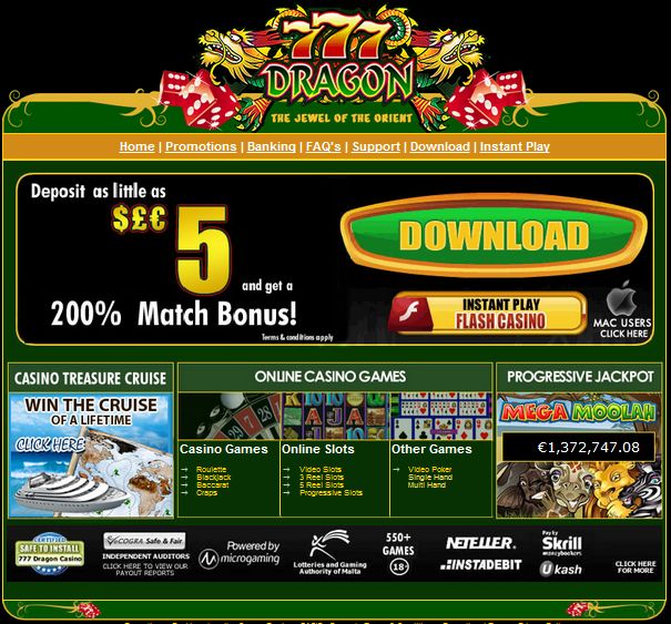 777 Dragon Casino is a reputable online casino that takes you through the myth and legend of the east. It is the place where luck meets fortune. Established in 2002, 777 Dragon Casino falls under the Vegas Partner Lounge Group, which has built an outstanding reputation for itself over the years. It is registered and licensed under Maltese law with the Lotteries and Gaming Authority of Malta. The casino is also regularly audited by an independent auditing body to ensure accurate, regular and speedy payouts.