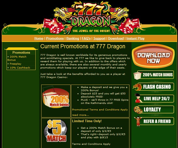 What is great about 777 Dragon Casino is that once signing up for free, you get the option to choose your Welcome Bonus. If you are an online casino novice, the best option to go for is the Free Play option. This entitles you to a lucky $777 to play with for an hour on any games you luck, whether you play the good old favourites or try your hand at something new. If you are a gaming veteran, maybe the 200% Match Bonus is more up your lantern lit alley. Deposit $25 and you get $75 in your account to use up. That is a complimentary $50, courtesy of 777 Dragon Casino. Players also get 77 Free Spins you get on Kathmandu – an eastern-themed 3 reel slot.