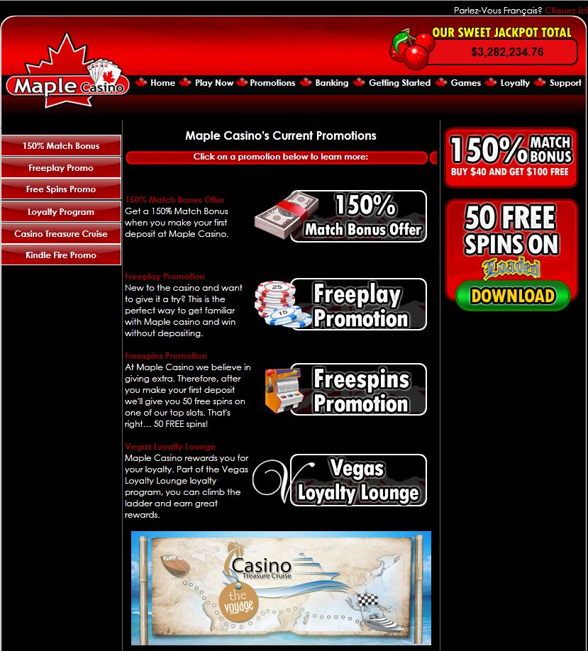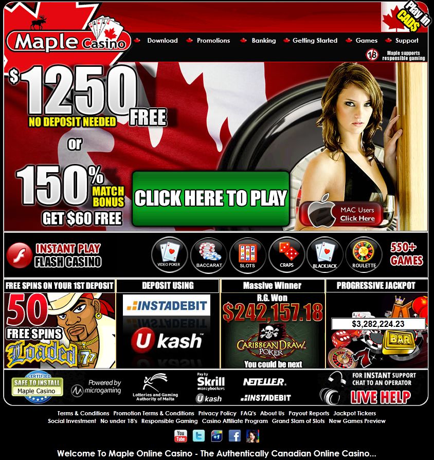 There is also a 150% Match Bonus offer which turns player’s initial $40 deposit into $100 – a free $60 on the house. Upon first deposit, players will also receive 50 FreeSpins on the Video Slot, Loaded. With monthly promotions on the go and loyalty rewards for players who belong to the Vegas Loyalty Lounge, players always get more at Maple. This reward program has 4-tiers – Blue, Silver, Gold and Platinum. The more points you earn playing at the casino, the higher you move in the program.