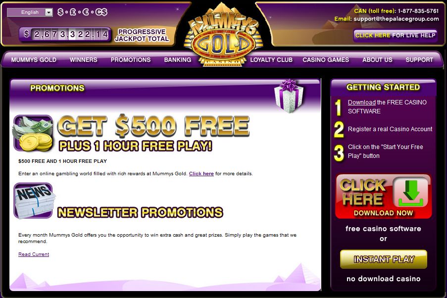 The Mummys Gold Casino newsletter provides information on additional bonuses and promotions. Currently, you can join the $2,000 Ultimate Poker Contest, the $2,000 Bonus Slot Bonanza or the $2,000 Progressive Table Party.